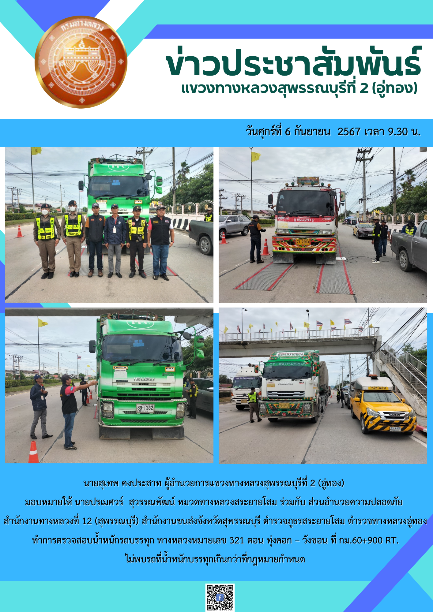 มอบหมายให้ นายปรเมศวร์ สุวรรณพัฒน์ หมวดทางหลวงสระยายโสม ร่วมกับ ส่วนอำนวยความปลอดภัย สำนักงานทางหลวงที่ 12 (สุพรรณบุรี)