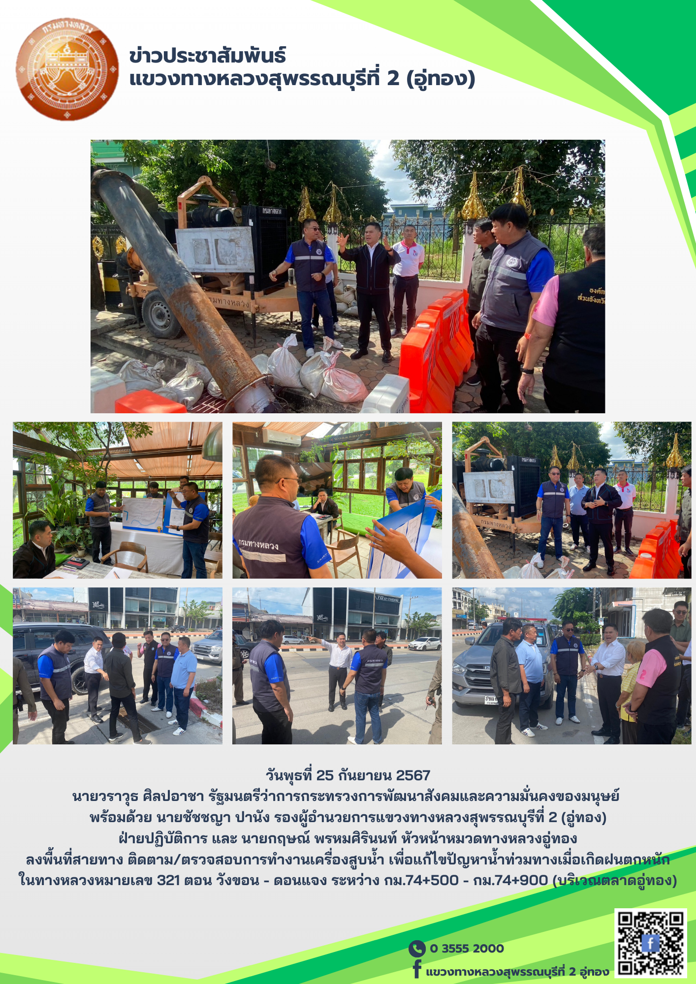 นายวราวุธ ศิลปอาชา รัฐมนตรีว่าการกระทรวงการพัฒนาสังคมและความมั่นคงของมนุษย์ พร้อมด้วย นายชัชชญา ปานัง รองผู้อำนวยการแขวงทางหลวงสุพรรณบุรีที่ 2 (อู่ทอง) ฝ่ายปฏิบัติการ และ นายกฤษณ์ พรหมศิรินนท์ หัวหน้าหมวดทางหลวงอู่ทอง ลงพื้นที่สายทาง ติดตาม/ตรวจสอบการทำงานเครื่องสูบน้ำ เพื่อแก้ไขปัญหาน้ำท่วมทางเมื่อเกิดฝนตกหนัก ในทางหลวงหมายเลข 321 ตอน วังขอน - ดอนแจง ระหว่าง กม.74+500 - กม.74+900 (บริเวณตลาดอู่ทอง)