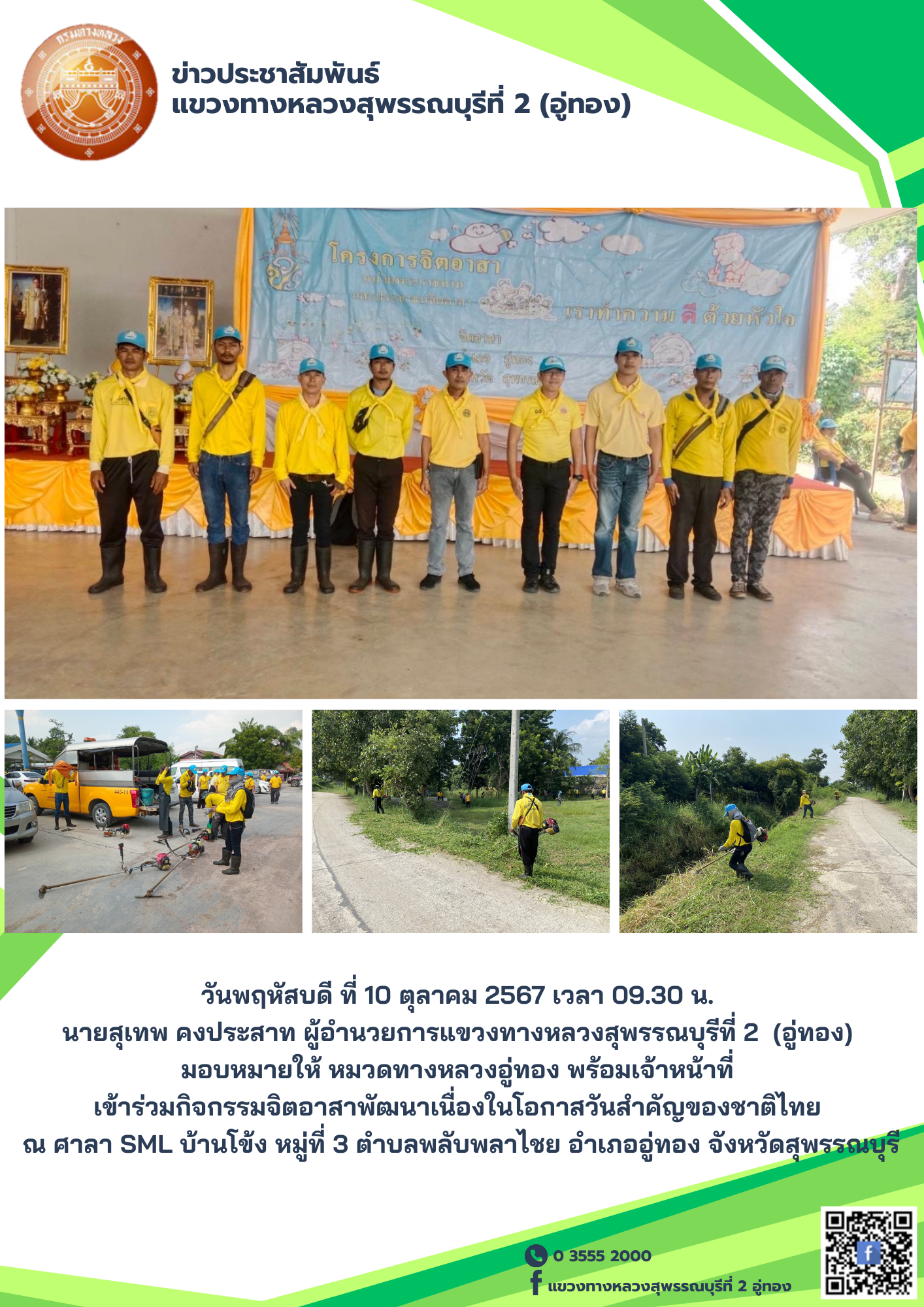 มอบหมายให้ หมวดทางหลวงอู่ทอง พร้อมเจ้าหน้าที่ เข้าร่วมกิจกรรมจิตอาสาพัฒนาเนื่องในโอกาสวันสำคัญของชาติไทย