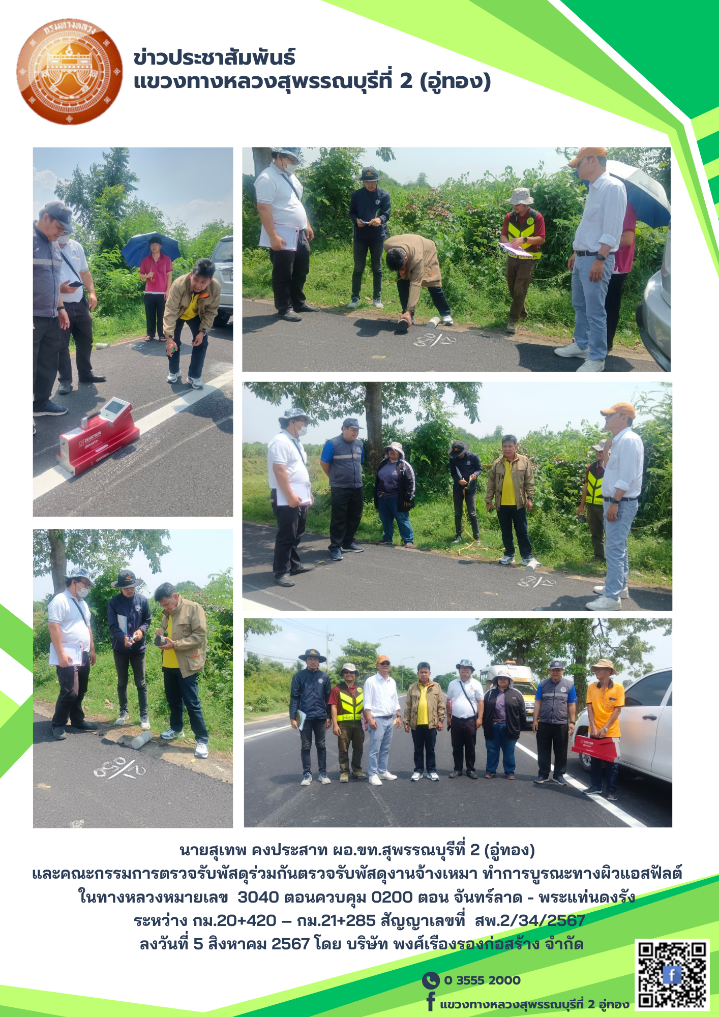 นายสุเทพ คงประสาท ผอ.ขท.สุพรรณบุรีที่ 2 (อู่ทอง) และคณะกรรมการตรวจรับพัสดุร่วมกันตรวจรับพัสดุงานจ้างเหมา ทำการบูรณะทางผิวแอสฟัลต์ ในทางหลวงหมายเลข 3040 ตอนควบคุม 0200 ตอน จันทร์ลาด - พระแท่นดงรัง ระหว่าง กม.20+420 – กม.21+285 สัญญาเลขที่ สพ.2/34/2567 ลงวันที่ 5 สิงหาคม 2567 โดย บริษัท พงศ์เรืองรองก่อสร้าง จำกัด