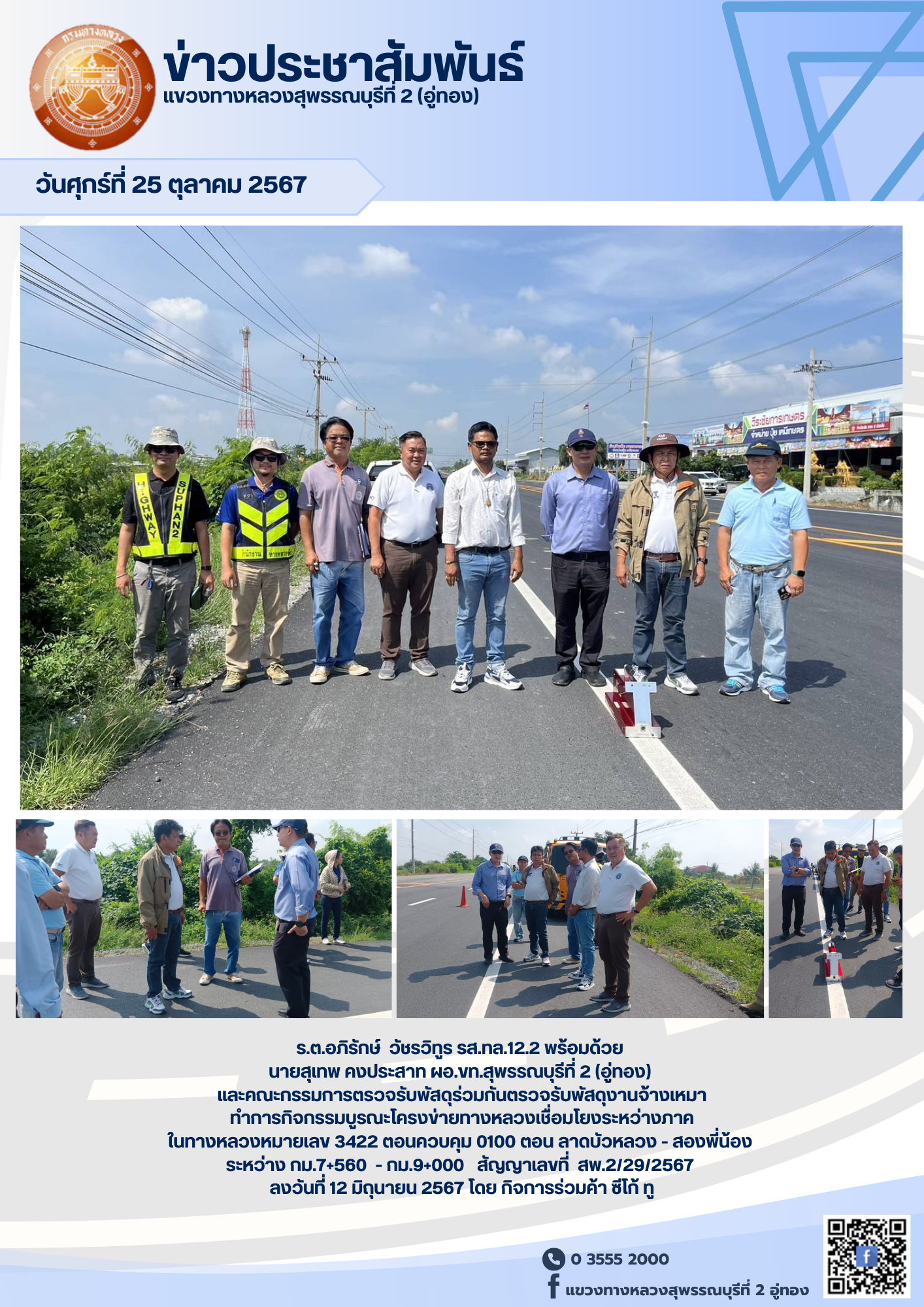 ตรวจรับพัสดุงานจ้างเหมา ทำการกิจกรรมบูรณะโครงข่ายทางหลวงเชื่อมโยงระหว่างภาค ในทางหลวงหมายเลข 3422 ตอนควบคุม 0100 ตอน ลาดบัวหลวง - สองพี่น้อง ระหว่าง กม.7+560 - กม.9+000