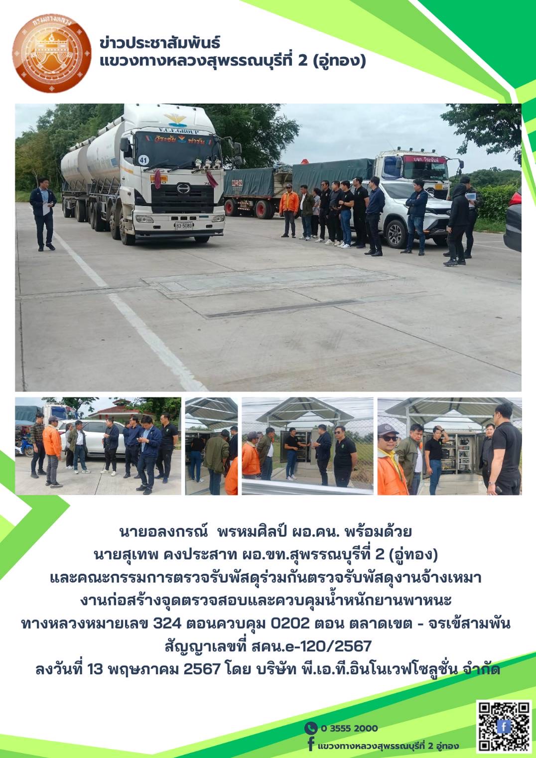 ข้อมูลภาพกิจกรรม : ตรวจรับพัสดุงานจ้างเหมา งานก่อสร้างจุดตรวจสอบและควบคุมน้ำหนักยานพาหนะ ทางหลวงหมายเลข 324 ตอนควบคุม 0202 ตอน ตลาดเขต - จรเข้สามพัน