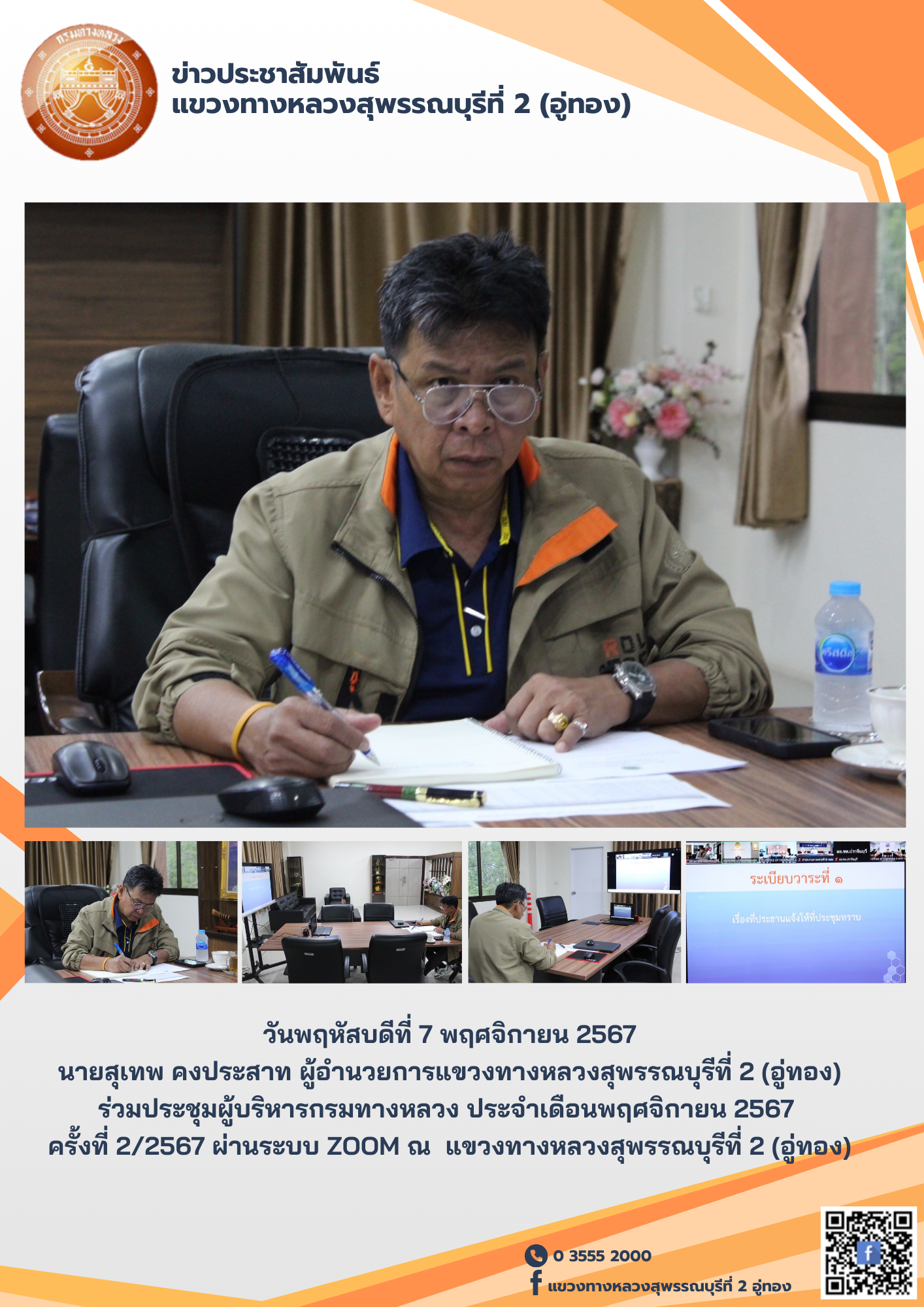 ร่วมประชุมผู้บริหารกรมทางหลวง ประจำเดือนพฤศจิกายน 2567 ครั้งที่ 2/2567 ผ่านระบบ ZOOM
