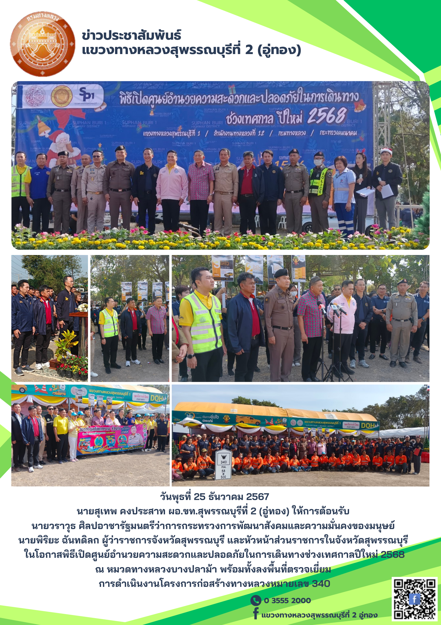 พิธีเปิดศูนย์อำนวยความสะดวกและปลอดภัยในการเดินทางช่วงเทศกาลปีใหม่ 2568 ณ หมวดทางหลวงบางปลาม้า พร้อมทั้งลงพื้นที่ตรวจเยี่ยม การดำเนินงานโครงการก่อสร้างทางหลวงหมายเลข 340