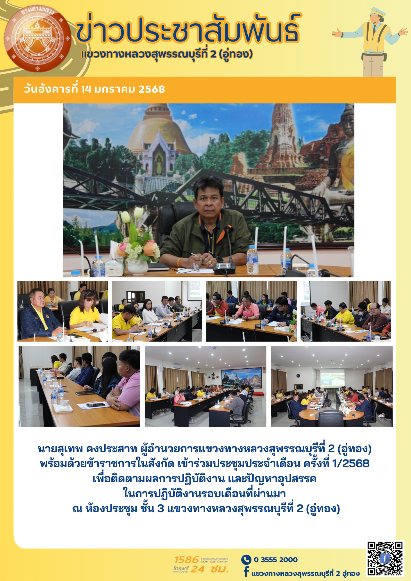 ประชุมประจำเดือน ครั้งที่ 1/2568 เพื่อติดตามผลการปฏิบัติงาน และปัญหาอุปสรรค ในการปฏิบัติงานรอบเดือนที่ผ่านมา ณ ห้องประชุม ชั้น 3 แขวงทางหลวงสุพรรณบุรีที่ 2 (อู่ทอง)