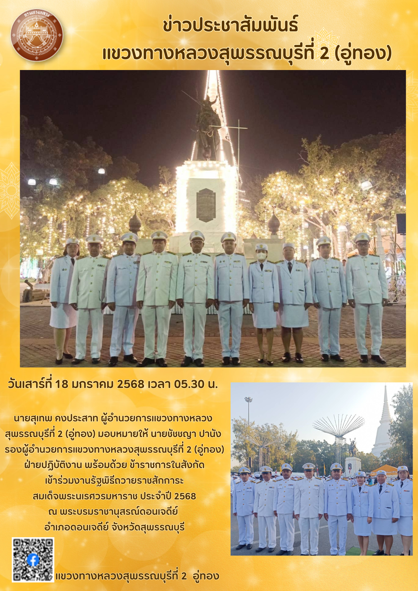 นายสุเทพ คงประสาท ผู้อำนวยการแขวงทางหลวงสุพรรณบุรีที่ 2 (อู่ทอง) มอบหมายให้