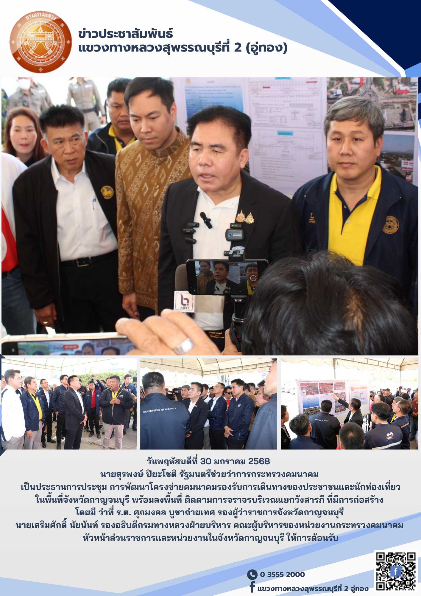 นายสุรพงษ์ ปิยะโชติ รัฐมนตรีช่วยว่าการกระทรวงคมนาคม เป็นประธานการประชุม การพัฒนาโครงข่ายคมนาคมรองรับการเดินทางของประชาชนและนักท่องเที่ยวในพื้นที่จังหวัดกาญจนบุรี พร้อมลงพื้นที่ ติดตามการจราจรบริเวณแยกวังสารภี ที่มีการก่อสร้าง โดยมี ว่าที่ ร.ต. ศุภมงคล บูชาถ่ายเทศ รองผู้ว่าราชการจังหวัดกาญจนบุรี นายเสริมศักดิ์ นัยนันท์ รองอธิบดีกรมทางหลวงฝ่ายบริหาร คณะผู้บริหารของหน่วยงานกระทรวงคมนาคม หัวหน้าส่วนราชการและหน่วยงานในจังหวัดกาญจนบุรี ให้การต้อนรับ