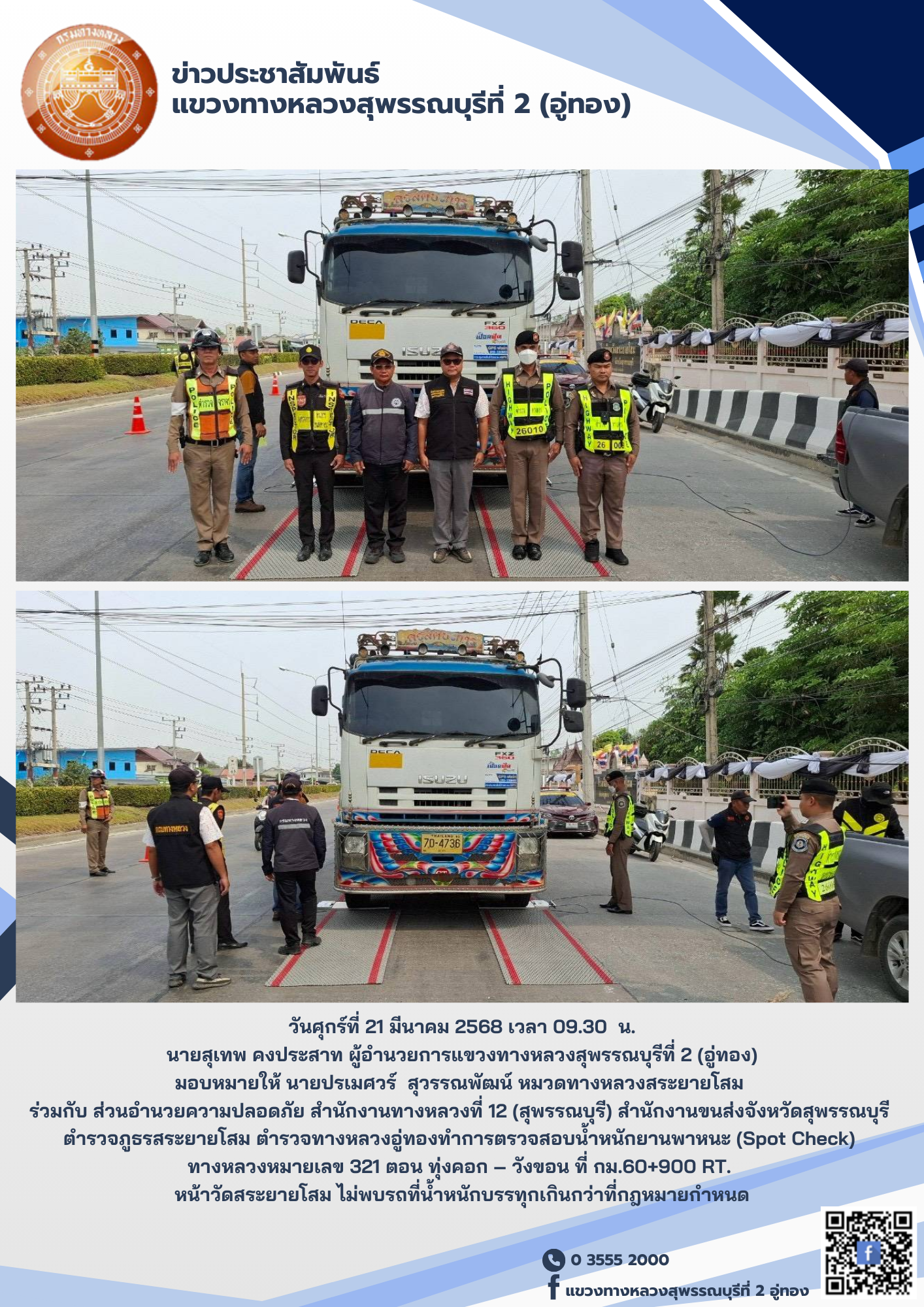 ตรวจสอบน้ำหนักยานพาหนะ (Spot Check) ทางหลวงหมายเลข 321 ตอน ทุ่งคอก – วังขอน ที่ กม.60+900 RT. หน้าวัดสระยายโสม ไม่พบรถที่น้ำหนักบรรทุกเกินกว่าที่กฎหมายกำหนด