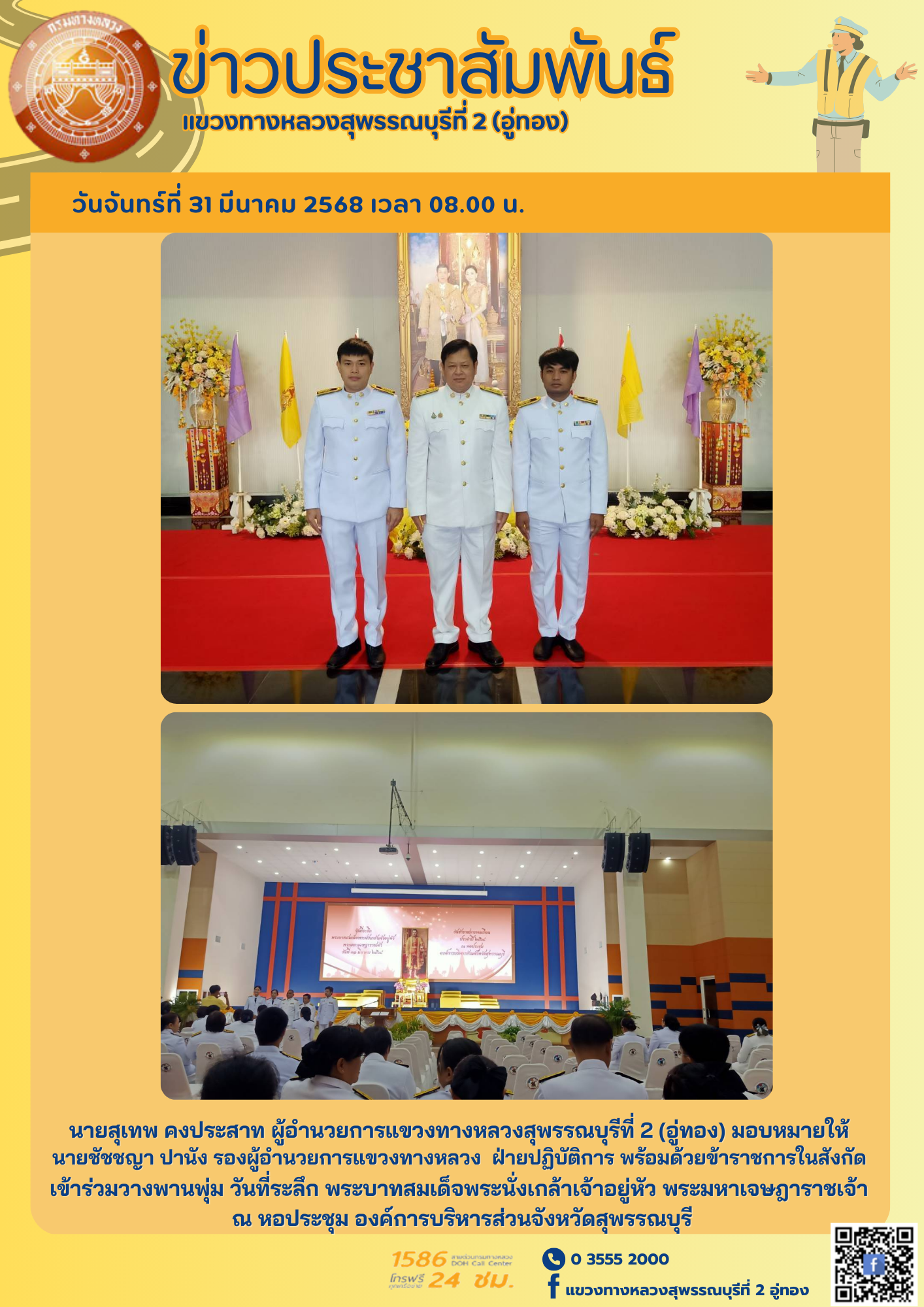 มอบหมายให้ นายชัชชญา ปานัง รองผู้อำนวยการแขวงทางหลวง ฝ่ายปฏิบัติการ พร้อมด้วยข้าราชการในสังกัด