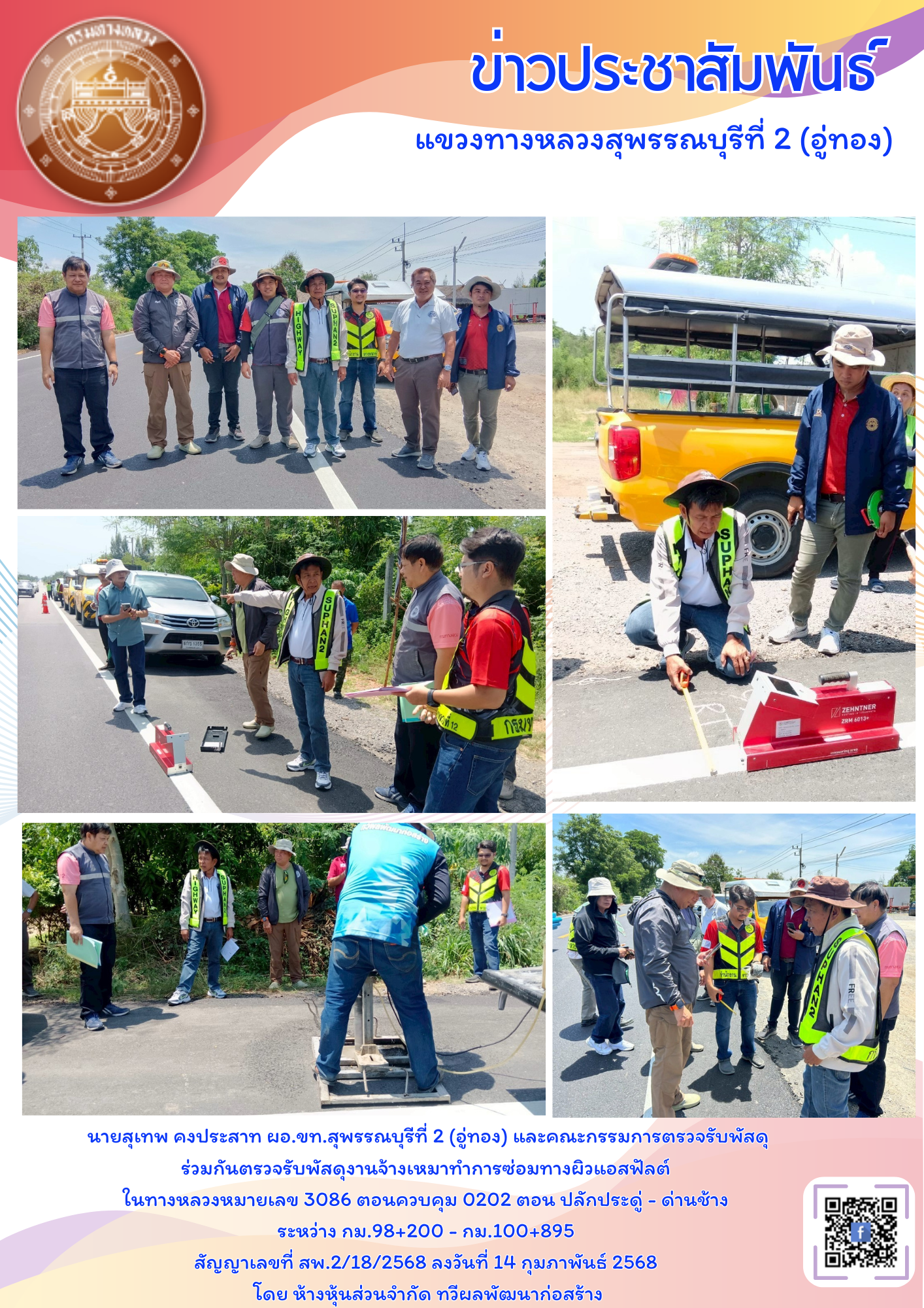ข้อมูลภาพกิจกรรม : ตรวจรับพัสดุงานจ้างเหมา ทำการซ่อมทางผิวแอสฟัลต์ ในทางหลวงหมายเลข 3086 ตอนควบคุม 0202 ตอน ปลักประดู่ - ด่านช้าง ระหว่าง กม.98+200 - กม.100+895