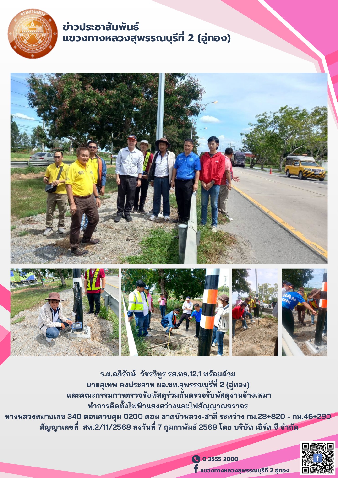 ข้อมูลภาพกิจกรรม : ตรวจรับพัสดุงานจ้างเหมาทำงานติดตั้งไฟฟ้าแสงสว่างและไฟสัญญาณจราจร ในทางหลวงหมายเลข 340 ตอนควบคุม 0200 ตอน ลาดบัวหลวง - สาลี ระหว่าง กม.28+820 - กม.46+290 (เป็นช่วง ๆ)