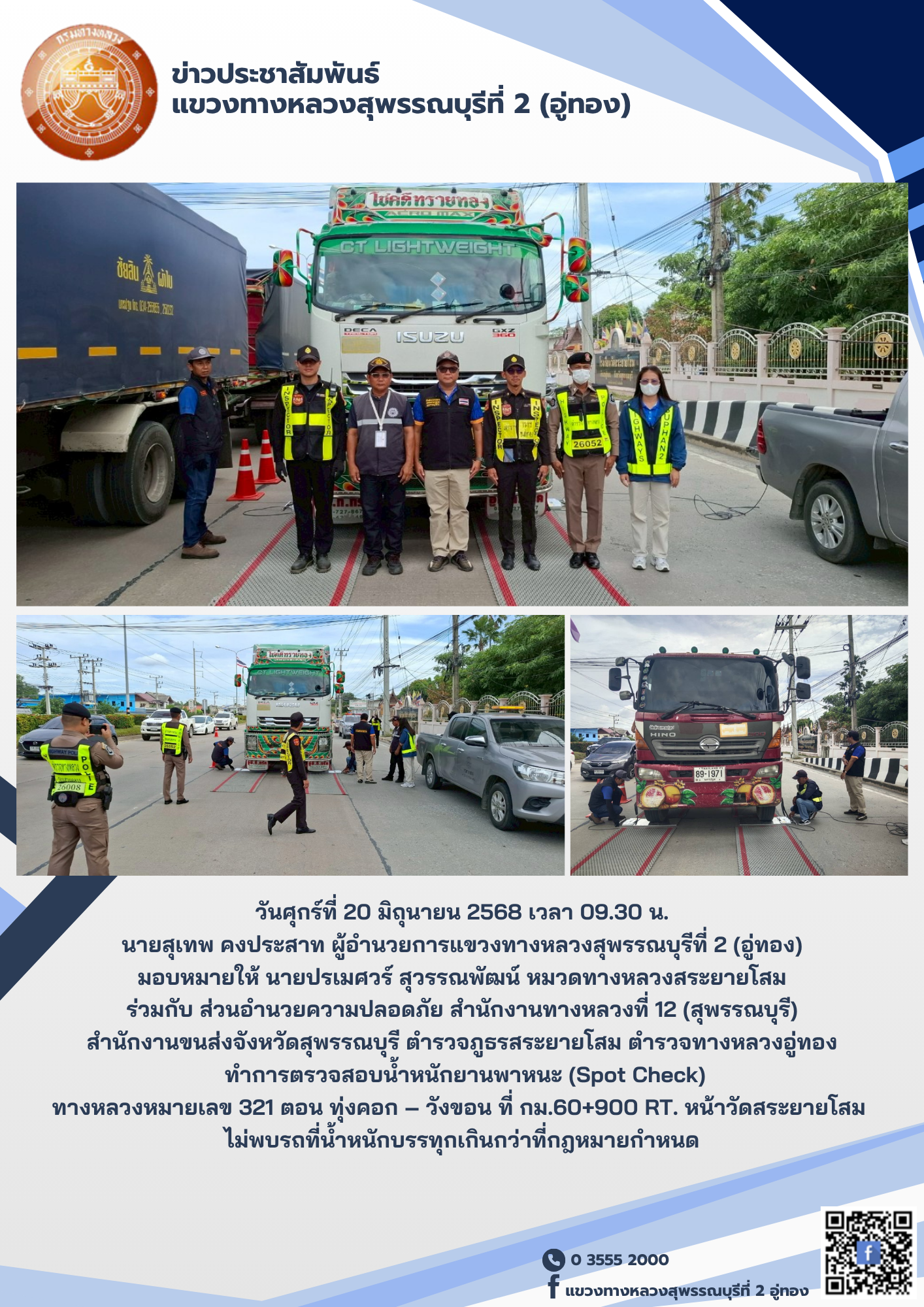 ตรวจสอบน้ำหนักยานพาหนะ (Spot Check) ทางหลวงหมายเลข 321 ตอน ทุ่งคอก – วังขอน ที่ กม.60+900 RT. หน้าวัดสระยายโสม ไม่พบรถที่น้ำหนักบรรทุกเกินกว่าที่กฎหมายกำหนด