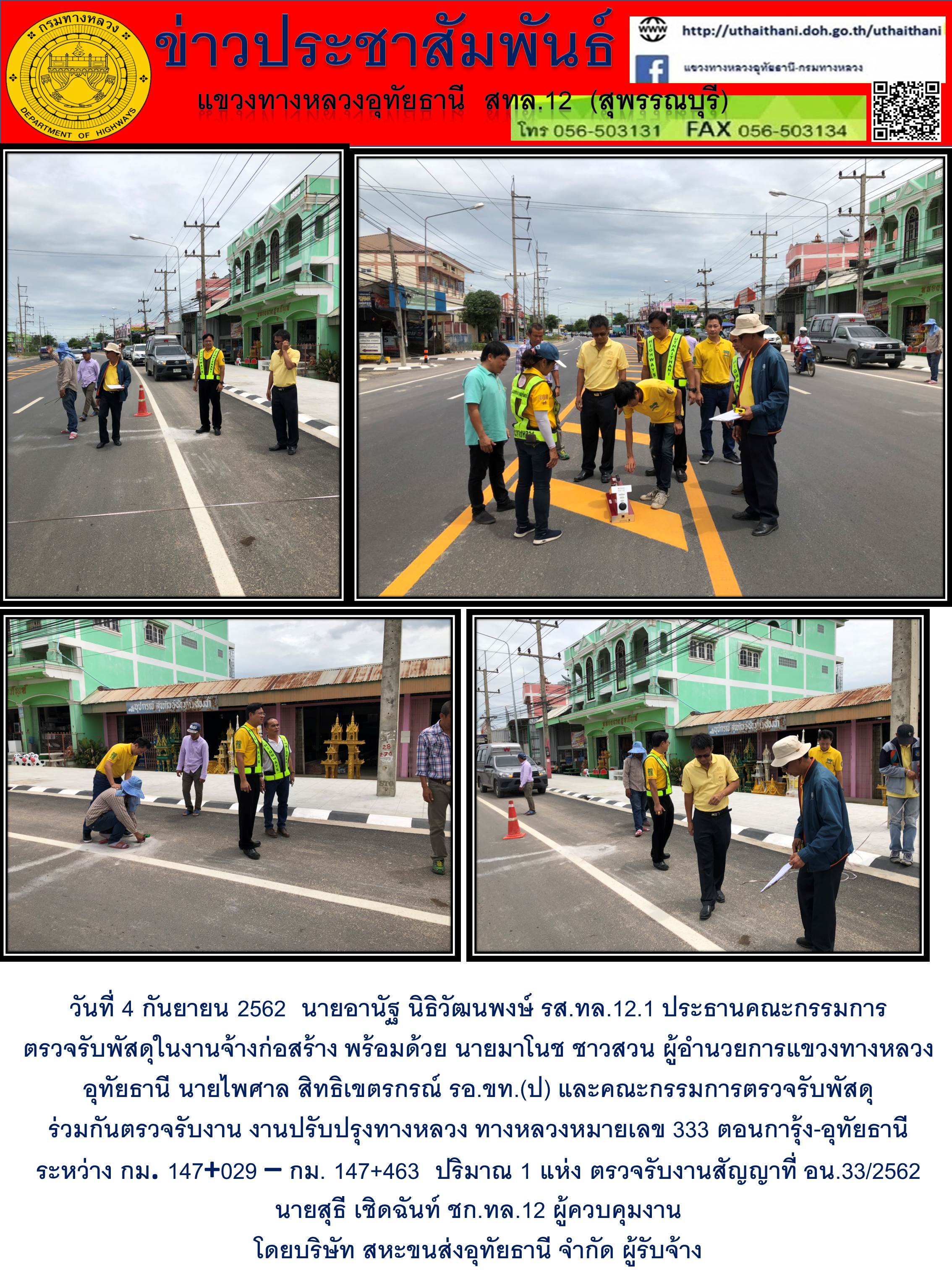 ตรวจรับงานโครงการบูรณะโครงข่ายทางหลวงเชื่อมโยงระหว่างภาค ทางหลวงหมายเลข 333 ตอนบ้านไร่-การุ้ง ระหว่าง กม.99+044 - กม.99+548 ระยะทางยาว 0.504 กม