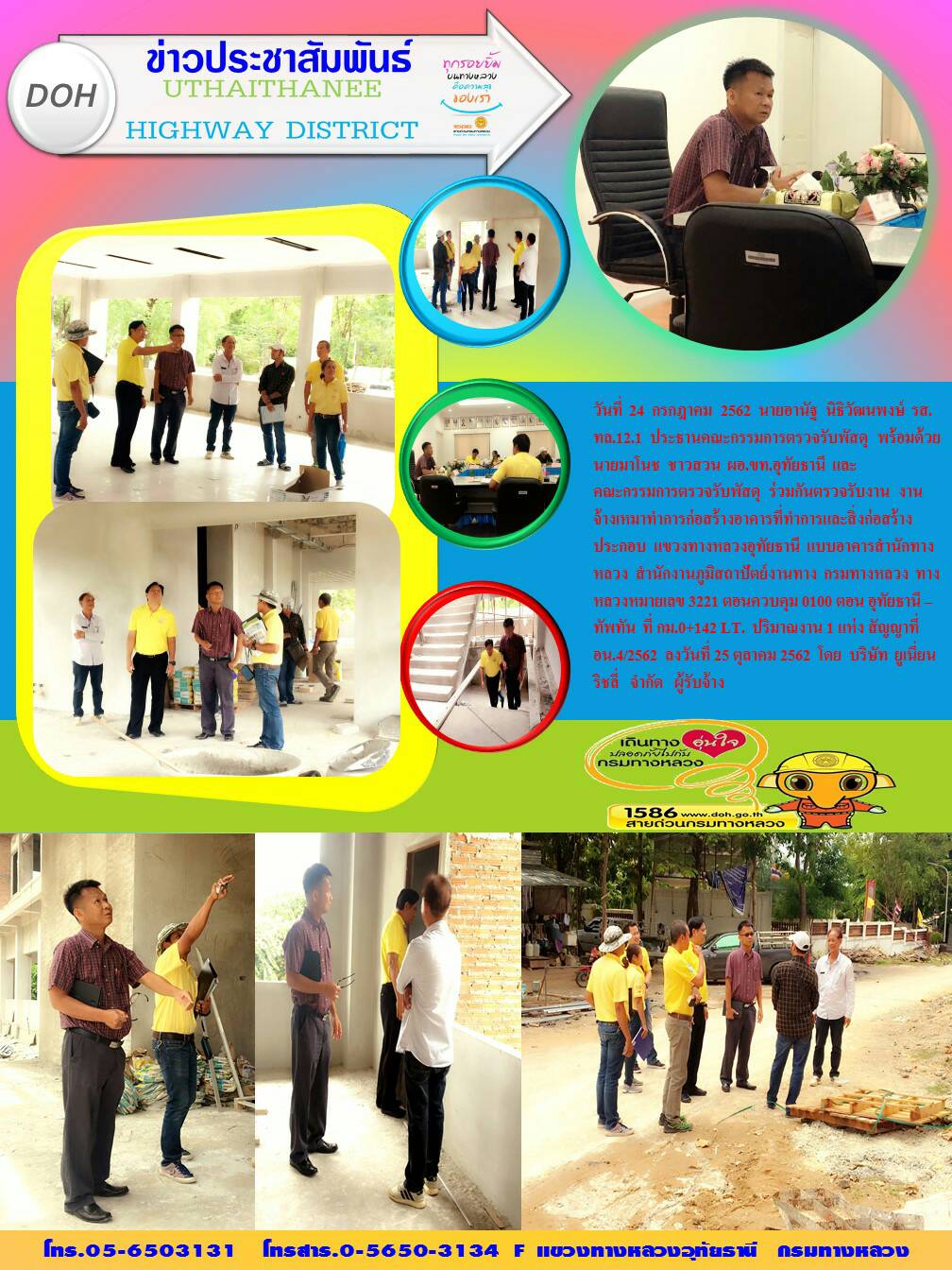 295 25/07/2562 ร่วมกันตรวจรับงาน งานจ้างเหมาทำการก่อสร้างอาคารที่ทำการและสิ่งก่อสร้างประกอบ แขวงทางหลวงอุทัยธานี แบบอาคารสำนักทางหลวง สำนักงานภูมิสถาปัตย์งานทาง กรมทางหลวง ทางหลวงหมายเลข 3221 ตอนอุทัยธานี-ทัพทัน ที่กม.0+142 ปริมาณ 1 แห่ง