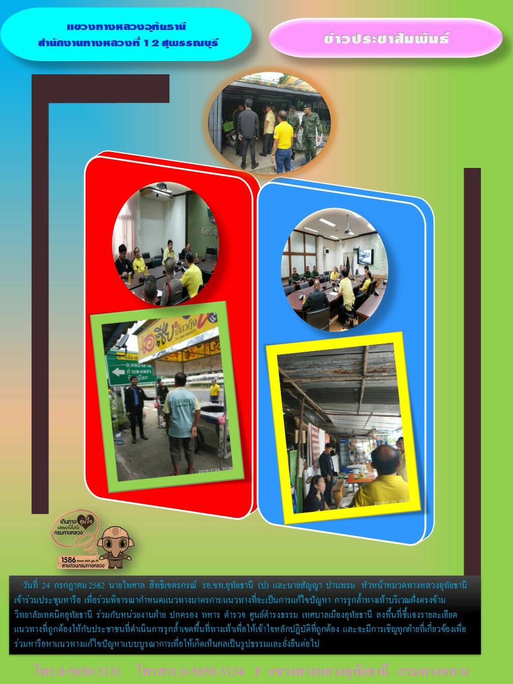 289 25/07/2562 ลงพื้นที่สำรวจรายชื่อผู้มีส่วนร่วมในการหาแนวทางแก้ปัญหาการรุกล้ำในเขตทางหลวงบริเวณทางเท้า ทางหลวงหมายเลข 3265 บริเวณหน้าวิทยาลัยเทคนิคอุทัยธานี เพื่อเชิญร่วมประชุมหาแนวทางแก้ปัญหา ในวันที่ 5 สิงหาคม 2562