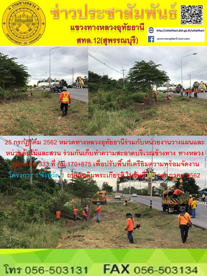 291 25/07/2562 ร่วมกันเก็บทำความสะอาดบริเวณข้างทาง ในทางหลวงหมายเลข 333 ตอนอุทัยธานี- สะพานข้ามแม่น้ำเจ้าพระยา ที่กม.170+875 เพื่อปรับพื้นที่เตรียมความพร้อมจัดงาน โครงการ 1 จังหวัด 1 ถนนเฉลิมพระเกียรติ ในวันที่ 28 กรกฎาคม 2562
