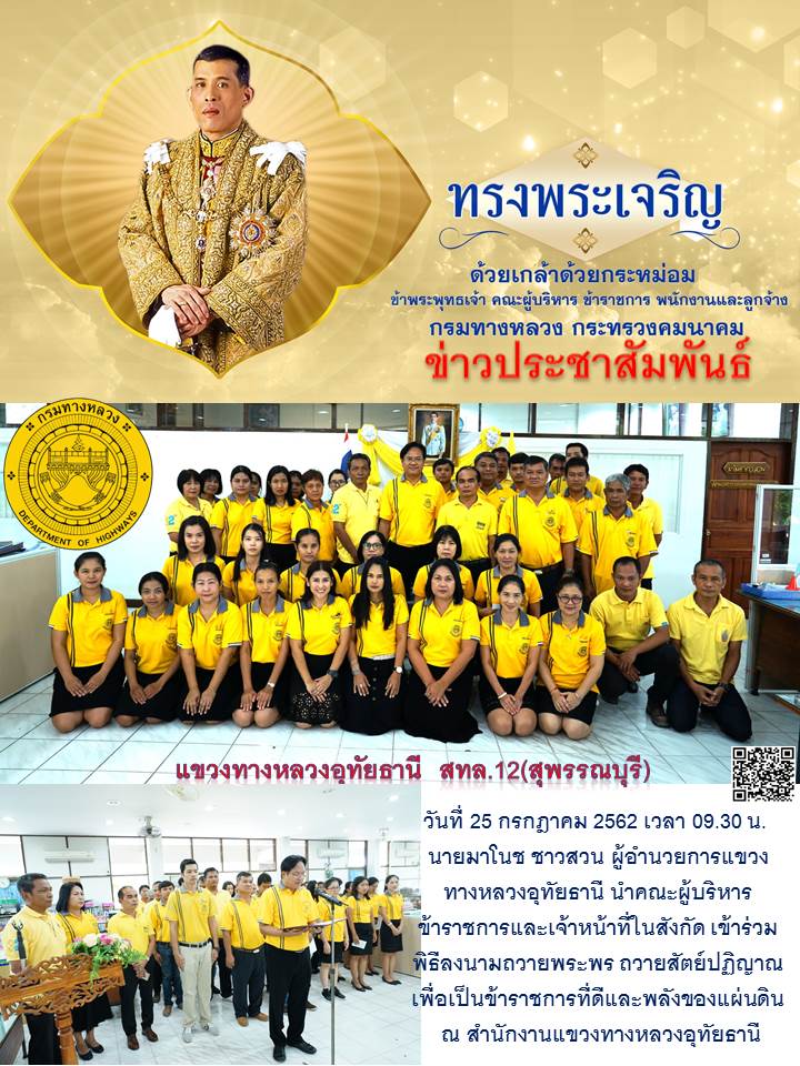 290 25/07/2562 นำคณะผู้บริหาร ข้าราชการและเจ้าหน้าที่ในสังกัด เข้าร่วมพิธีลงนามถวายพระพร ถวายสัตย์ปฏิญาณเพื่อเป็นข้าราชการที่ดีและพลังของแผ่นดิน ณ สำนักงานแขวงทางหลวงอุทัยธานี