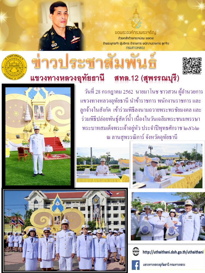 287 30/07/2562 ร่วมพิธีลงนามถวายพระพรชัยมงคลและปล่อยพันธุ์สัตว์น้ำ เนื่องในวันเฉลิมพระชนมพรรษาพระบาทสมเด็จพระเจ้าอยู่หัว ประจำปีพุทธศักราช 2562 ณ ลานสุพรรณิการ์ อำเภอเมืองอุทัยธานี จังหวัดอุทัยธานี