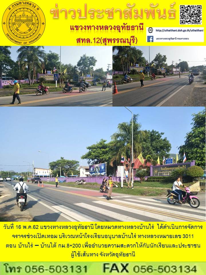 วันที่ 16 พฤษภาคม 2562เวลา 07.30น. หมวดทางหลวงบ้านไร่ ดำเนินการติดตั้งอุปกรณ์อำนวยความปลอดภัย ตามรูปแบบมาตรฐานครบถ้วน บริเวณหน้าโรงเรียนอนุบาลบ้านไร่ ทางหลวงหมายเลข 3011 ตอนบ้านไร่- บ้านใต้ ที่กม.8+200
