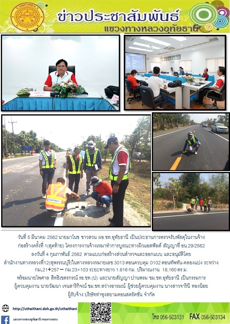 ตรวจรับงานโครงการบูรณะโครงข่ายทางหลวงเชื่อมโยงระหว่างภาค ทางหลวงหมายเลข 333 ตอนบ้านไร่-การุ้ง ระหว่าง กม.99+044 - กม.99+548 ระยะทางยาว 0.504 กม