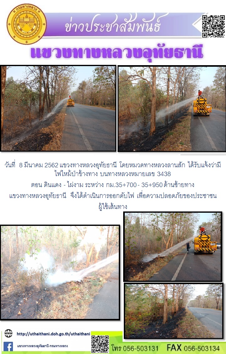 ดับไฟไหม้ข้างทาง บนทางหลวงหมายเลข 3438 ตอน ดินแดง - ไผ่งาม จำนวน 2 จุด จุดที่ 1ช่วงระหว่าง กม.25+900 - 26+200 ด้านซ้ายทาง จุดที่2 ช่วง กม.35+000 - 35+300 ด้านขวาทาง