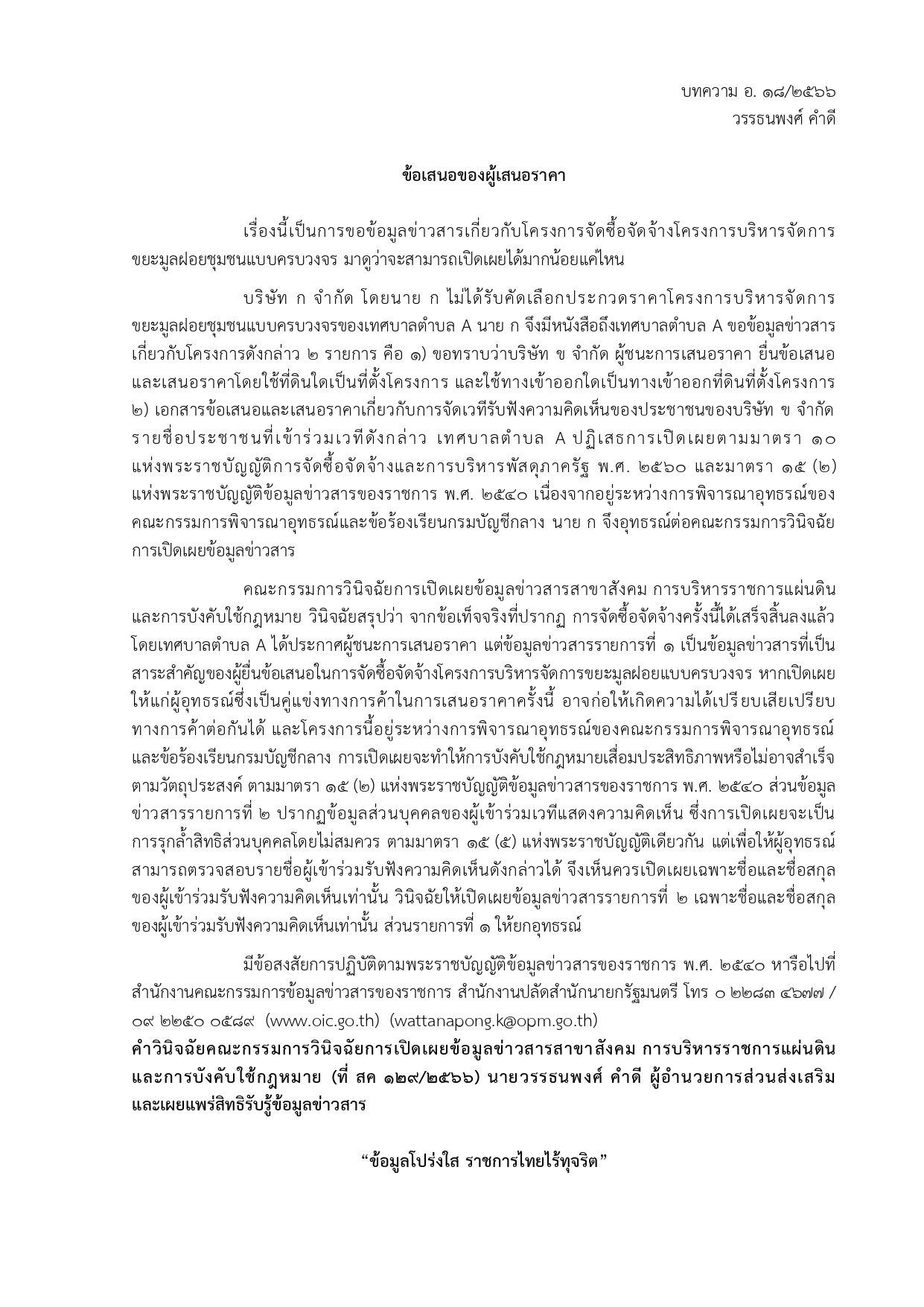 เอกสารเผยแพร่ความรู้เกี่ยวกับพระราชบัญญัติข้อมูลข่าวสารของราชการ พ.ศ. 2540
