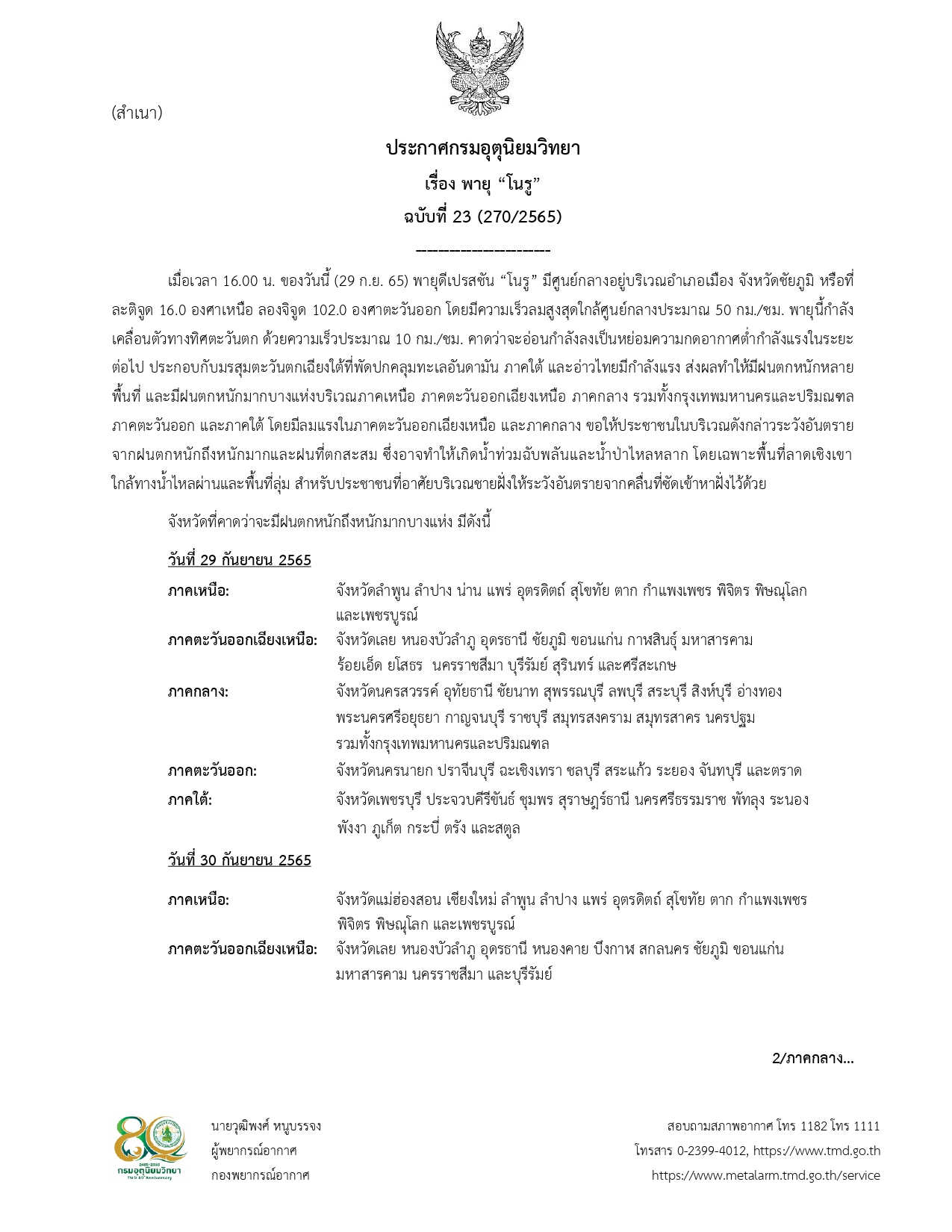 ประกาศกรมอุตุนิยมวิทยา เรื่อง พายุ "โนรู"