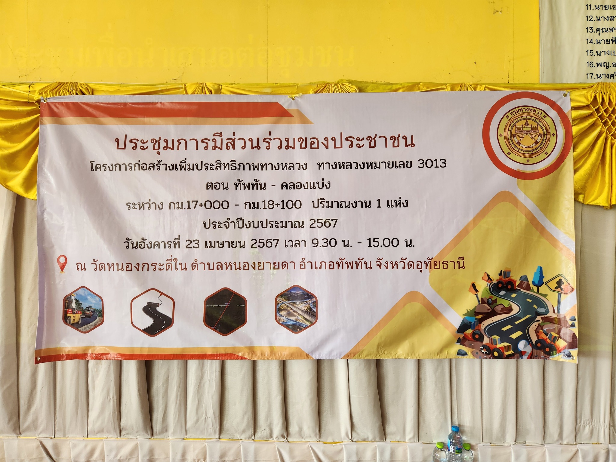 แขวงทางหลวงอุทัยธานีจัดงานประชุมการมีส่วนร่วมของประชาชนโครงการก่อสร้างเพิ่มประสิทธิภาพทางหลวง ทางหลวงหมายเลข 3013 ตอน ทัพทัน - คลองแบ่ง ระหว่าง กม.17+000 - กม.18+100 ปริมาณงาน 1 แห่ง ประจำปีงบประมาณ 2567 ณ วัดหนองกระดี่ใน ตำบลหนองยายดา อำเภอทัพทัน จังหวัดอุทัยธานี