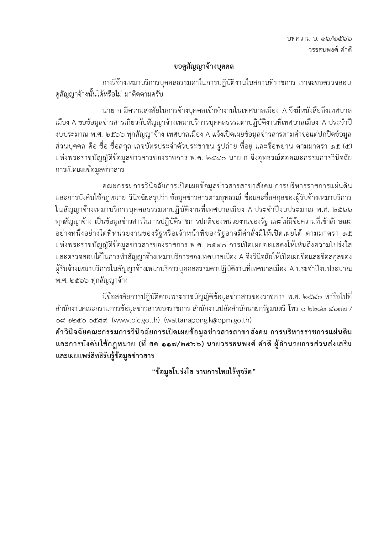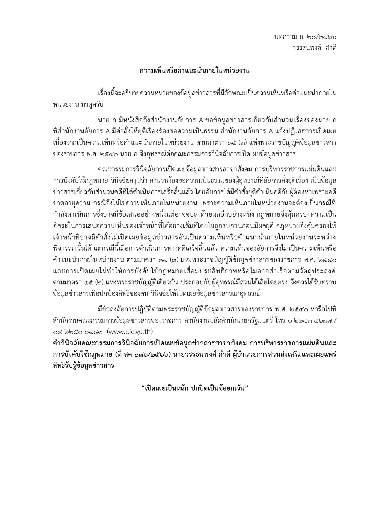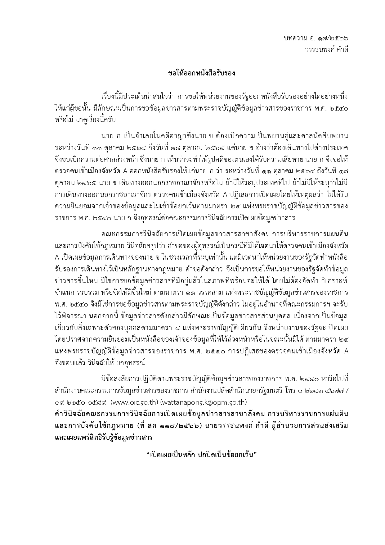 ด้วยสำนักงานปลัดสำนักนายกรัฐมนตรี โดยสำนักงานคณะกรรมการข้อมูลชาวสารของราชการ ได้จัดทำบทความสรุปประเด็นคำวินิจฉัยของคณะกรรมการวินิจฉัยการเปิดเผยข้อมูลข่าวสาร