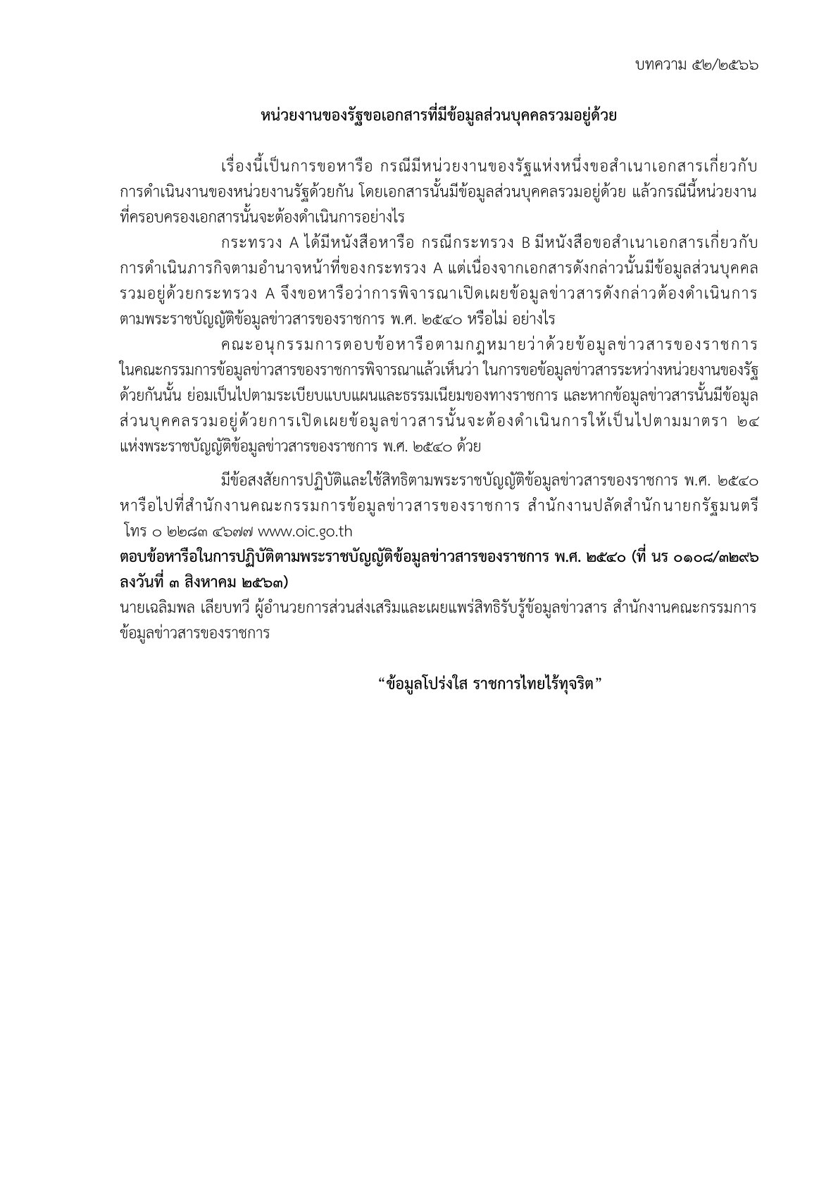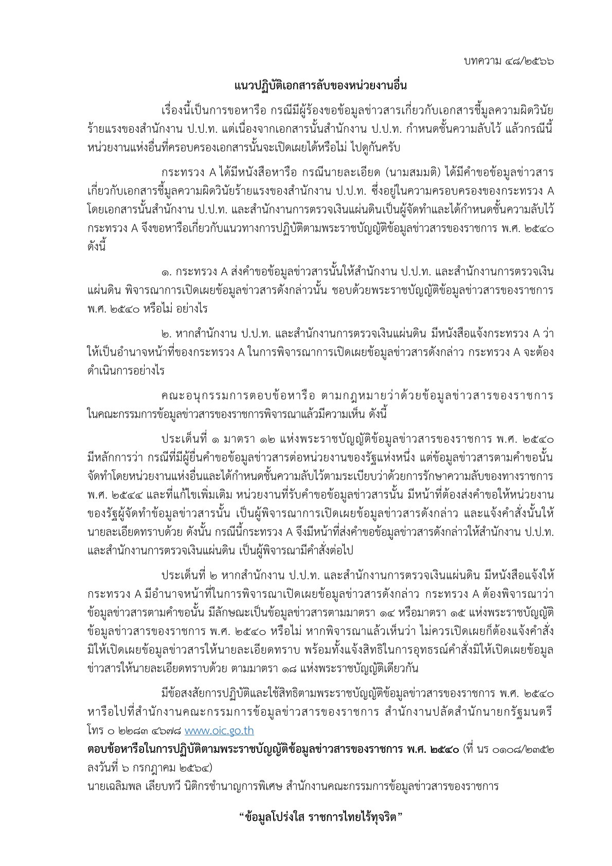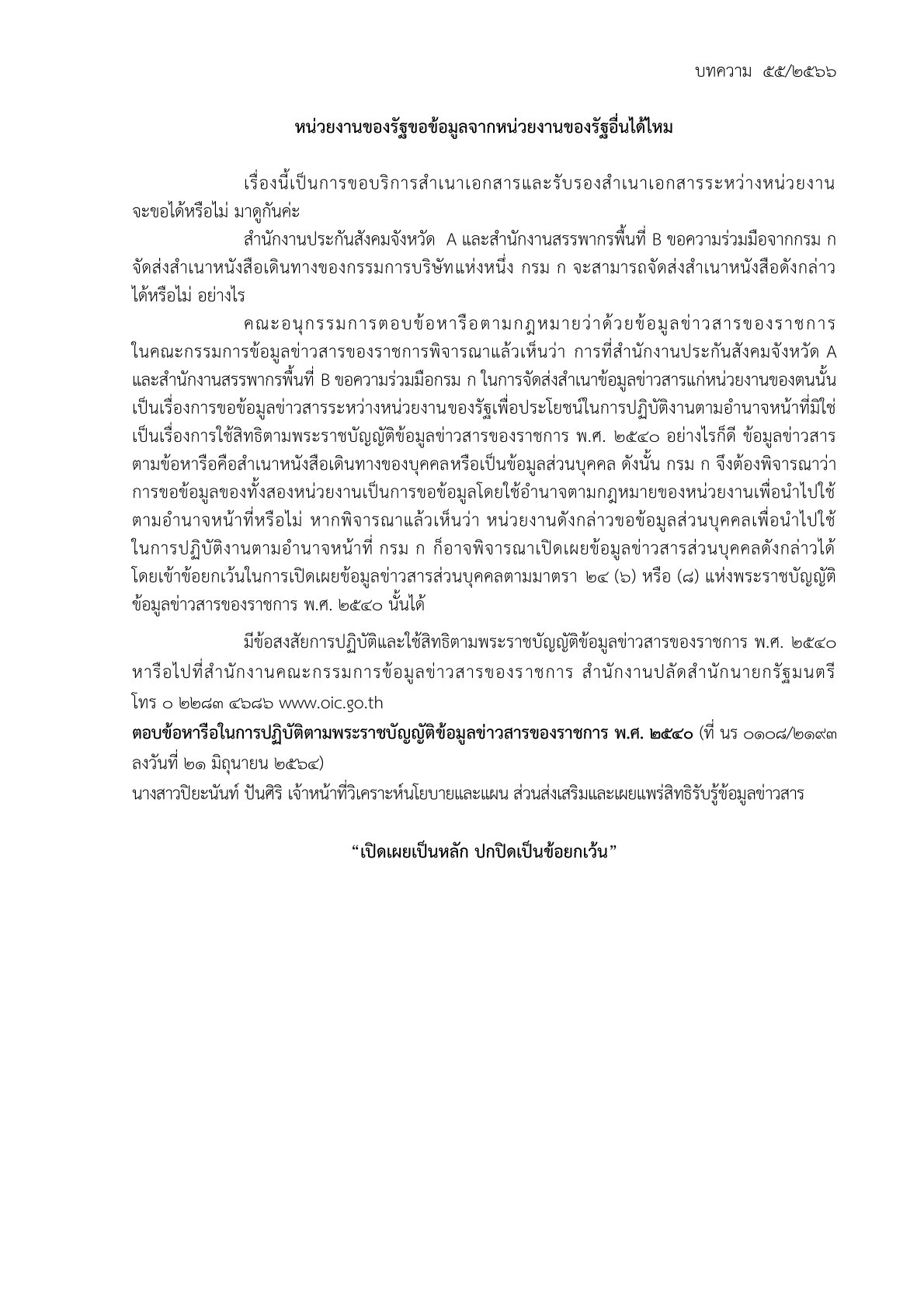 ด้วยสำนักงานปลัดสำนักนายกรัฐมนตรี โดยสำนักงานคณะกรรมการข้อมูลข่าวสารของราชการได้จัดทำบททความสรุปประเด็นคำวินิจฉัยของคณะกรรมการวินิจฉัยการเปิดเผยข้อมูลข่าวสาร และประเด็นข้อหารือ เพื่อเป็นเอกสารเผยแพร่ความรู้เกี่ยวกับพระราชบัญญัติข้อมูลข่าวสารของราชการ พ.ศ. 2540